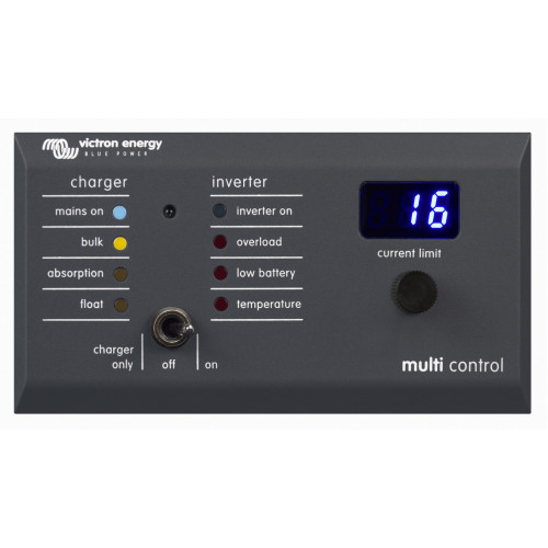 The Digital Multi Control is used to remotely view and adjust AC input currents, and turn on and off the Multi or Quattro. It is designed to integrate cleanly with your boat, vehicle or house system control panel.